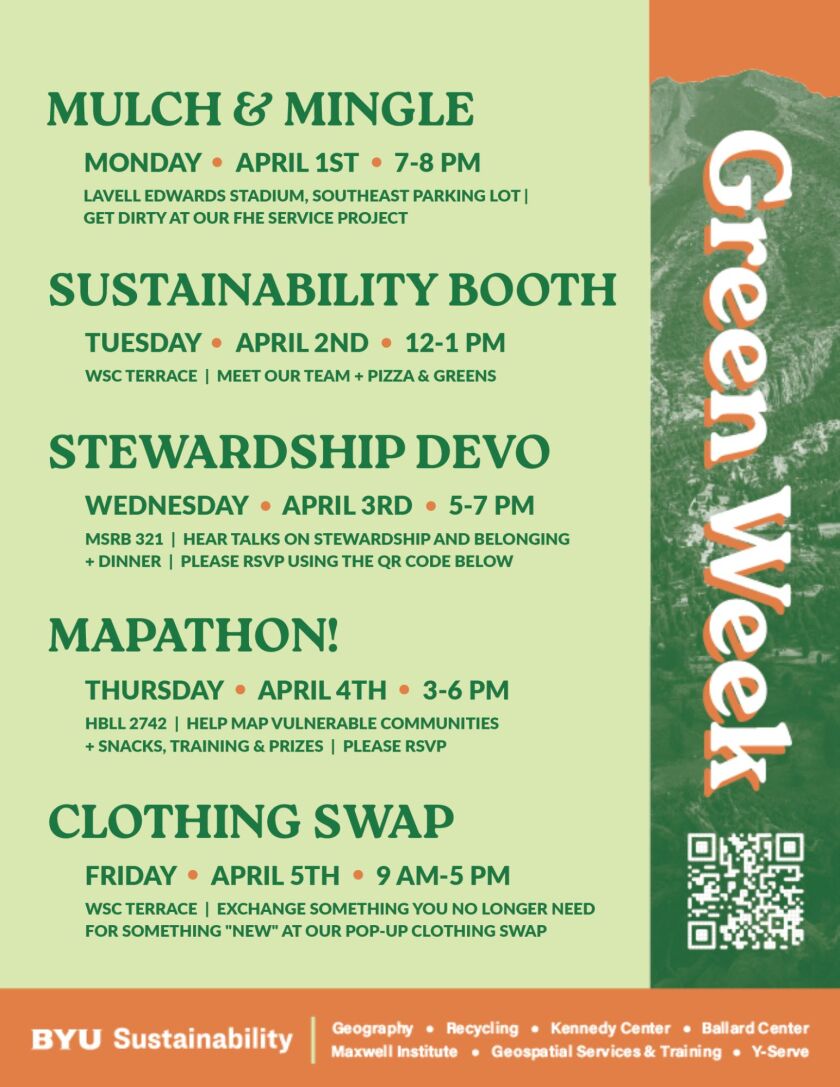 Thanks to our campus partners: the Maxwell Institute for Religious Scholarship, the Kennedy Center for International Studies, the Ballard Center for Social Impact, the Center for Service and Learning (Y-Serve), BYU Recycling, the Geography Department, and the Geospatial Services and Training Lab.